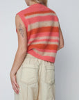 Gorgeous knitted vest with wide, horizontal stripes, round neck, and button closure at the front.